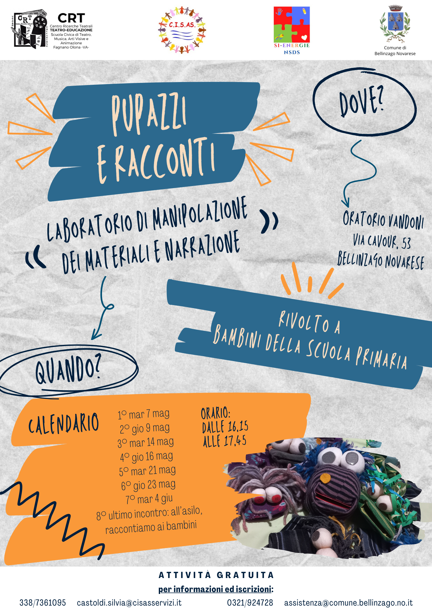 Pupazzi e Racconti è il nome che si è voluto dare al Laboratorio proposto nell'ambito del Progetto Si Energie Plus e curato dal CRT “Teatro-Educazione” Centro Ricerche Teatrali - Scuola Civica di Teatro, Musica, Arti Visive e Animazione di Fagnano Olona (VA), un organismo culturale senza fini di lucro che promuove l’educazione, la formazione artistica e l’espressività creativa nel campo del teatro, della musica, delle arti visive e di animazione e l’interesse per l'Arte, per la promozione e il pieno sviluppo della persona con particolare riguardo alle esigenze delle giovani generazioni.