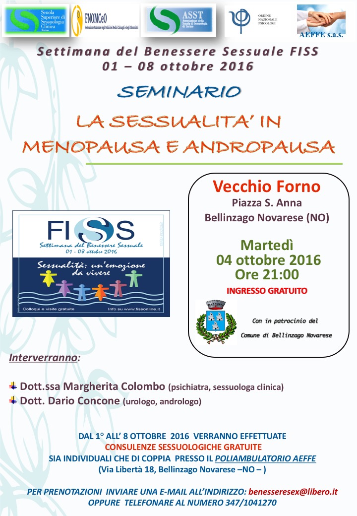 In occasione della Settimana del Benessere Sessuale indetta dalla FISS (Federazione Italiana di Sessuologia Scientifica), con il patrocinio del Ministero della Salute, di FNOMCeO (Federazione Nazionale degli Ordini dei Medici e degli Odontoiatri), dell'Ordine Nazionale Psiocologi, del Comune di Bellinzago Novarese, di ASST (Associazione della Scuola di Sessuologia di Torino) e di SSSC (Scuola Superiore di Sessuologia Clinica di Torino) è stato organizzato un seminario gratuito il giorno 4 ottobre 2016 alle ore 21.00 presso il Vecchio Forno di Bellinzago Novarese (NO) dal titolo "La sessualità in menopausa e andropausa".