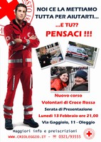 La Croce Rossa Italiana, Comitato Locale di Oleggio, informa che lunedì 13/02/2012 alle ore 21.00, presso la sede di Via Gaggiolo n. 11 si svolgere la serata di presentazione del nuovo corso per aspiranti Volontari di Croce Rossa.