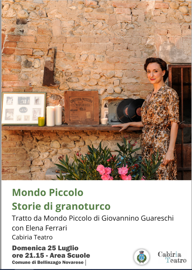 Domenica 25 luglio, con inizio alle ore 21.15, presso l'area scuole di via Vescovo Bovio, si terrà lo spettacolo teatrale "Mondo Piccolo - Storie di Granoturco" a cura della compagnia teatrale "Cabiria Teatro", tratto da "Mondo Piccolo" di Giovannino Guareschi.