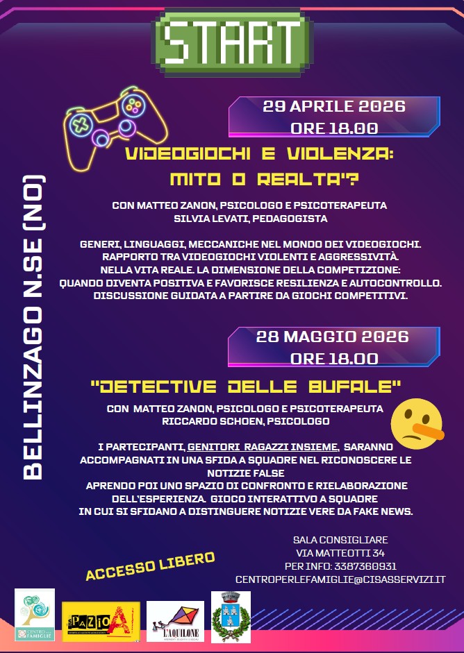 Il 29 aprile e il 28 maggio, alle ore 18.00 presso la Sala consiliare del Comune di Bellinzago Novarese, si terranno due serate dedicate a ragazzi e genitori su temi di rilevante interesse e attualità, per approfondire il rapporto tra videogiochi violenti e aggressività e mettere alla prova le proprie capacità critiche per distinguere la buona informazione dalle fakenews.