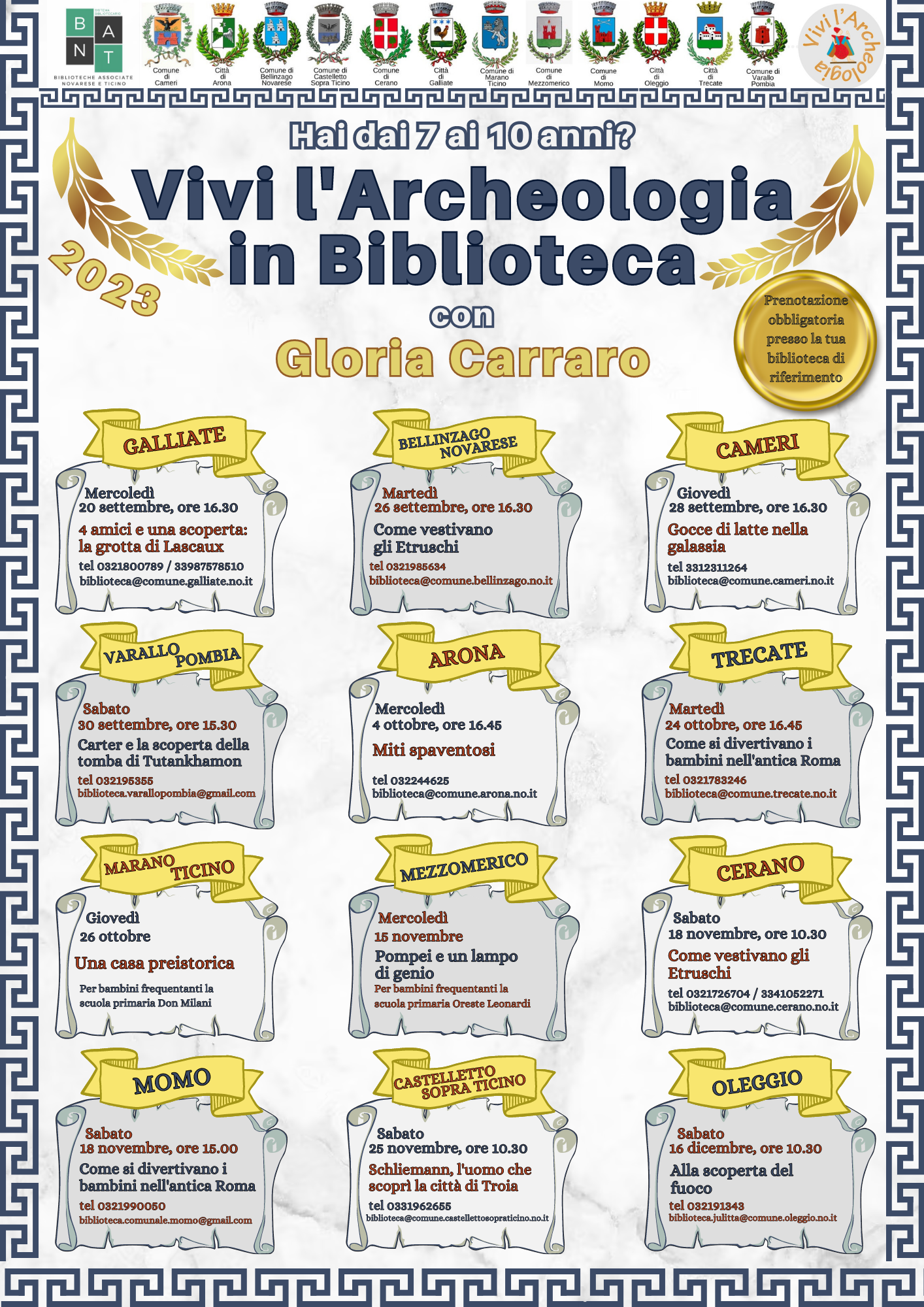 E ancora: il 4 ottobre ad Arona «Miti spaventosi», il 24 a Trecate «Come si divertivano i bambini nell’antica Roma», il 26 a Marano Ticino «Una casa preistorica» poi il 16 novembre a Mezzomerico «Pompei e un lampo di genio»,il 18 a Cerano «Come vestivano gli etruschi» e a Momo «Come si divertivano i bambini nell’antica Roma», il 25 a Castelletto Ticino «Schliemann, l’uomo che scoprì la città di Troia» e il 16 dicembre a Oleggio «Alla scoperta del fuoco». Le lezioni sono tenute da Gloria Carraro, archeologa e consulente culturale: si può scoprire anche il sito vivilarcheologia.it.