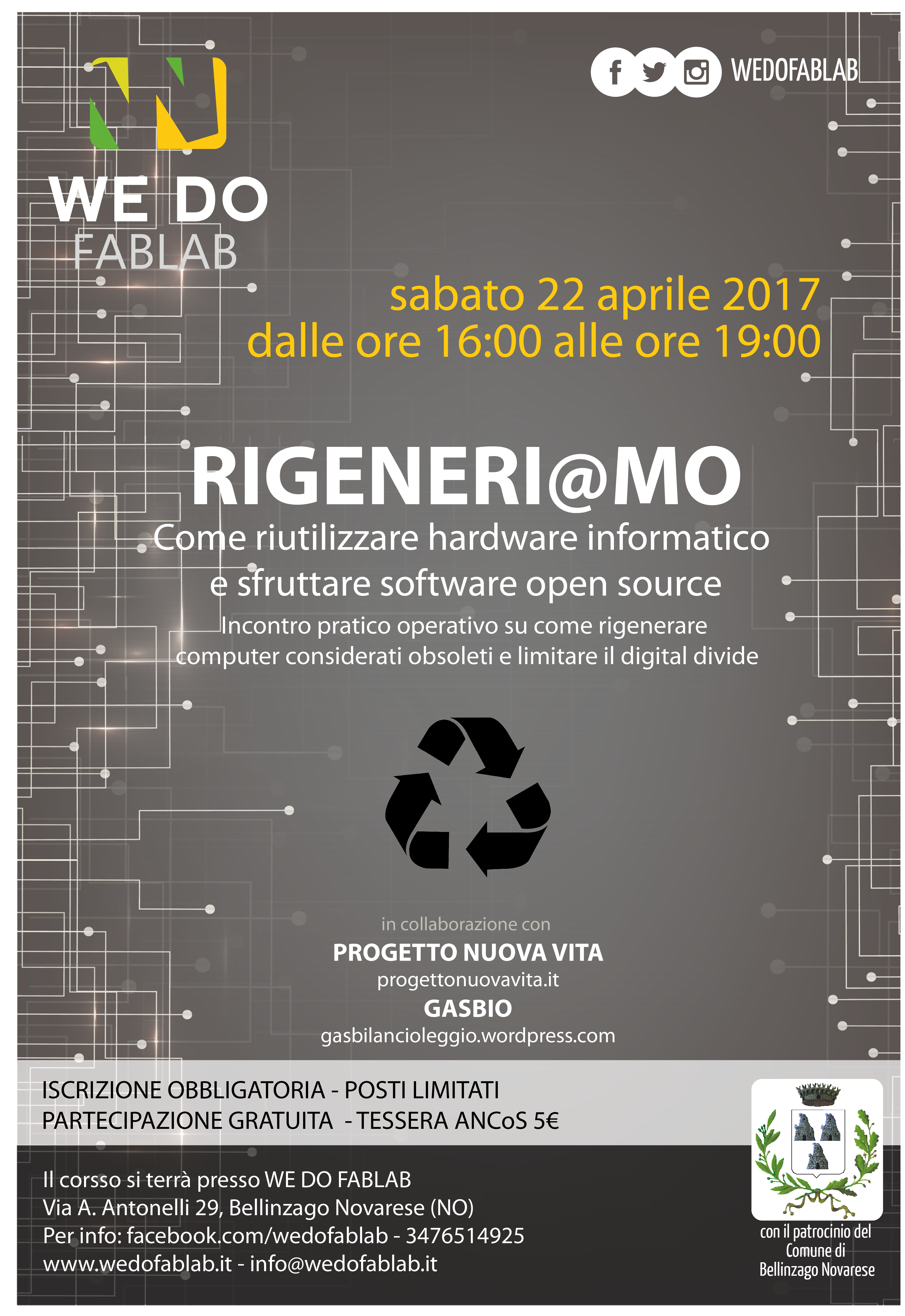 Iscrizione obbligatoria. Tessera ANCoS 5€. Partecipazione gratuita fino ad esaurimento posti. Per informazioni: info@wedofablab.it - 3476514925 - www.wedofablab.it