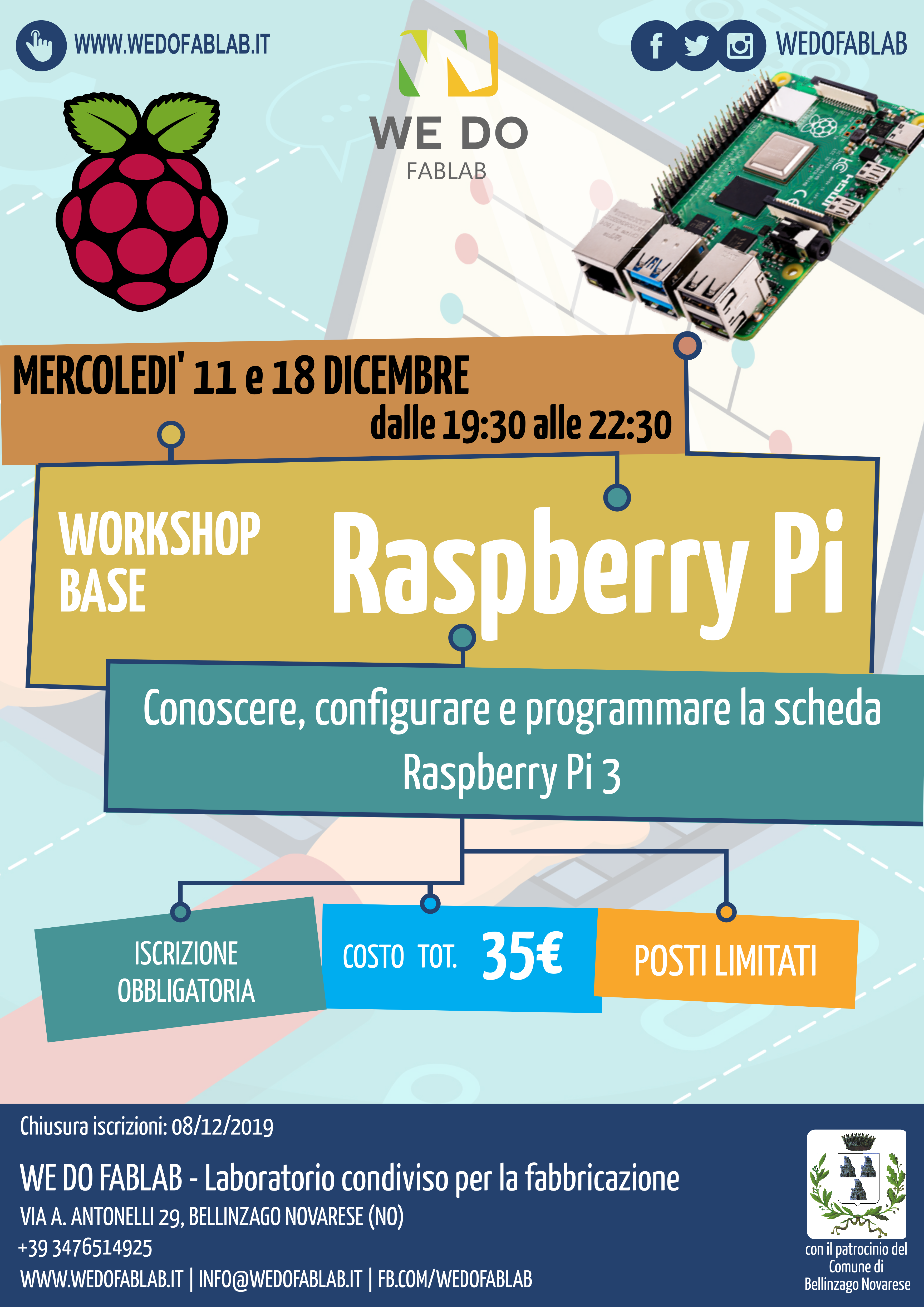 Nei giorni 11 e 18 dicembre 2019 dalle 19,30 alle 22,30 presso la sede dell'Associazione We Do Fablab in via Antonelli,29 si terrà un workshop base su scheda Raspberry Pi 3. Iscrizione obbligatoria.
